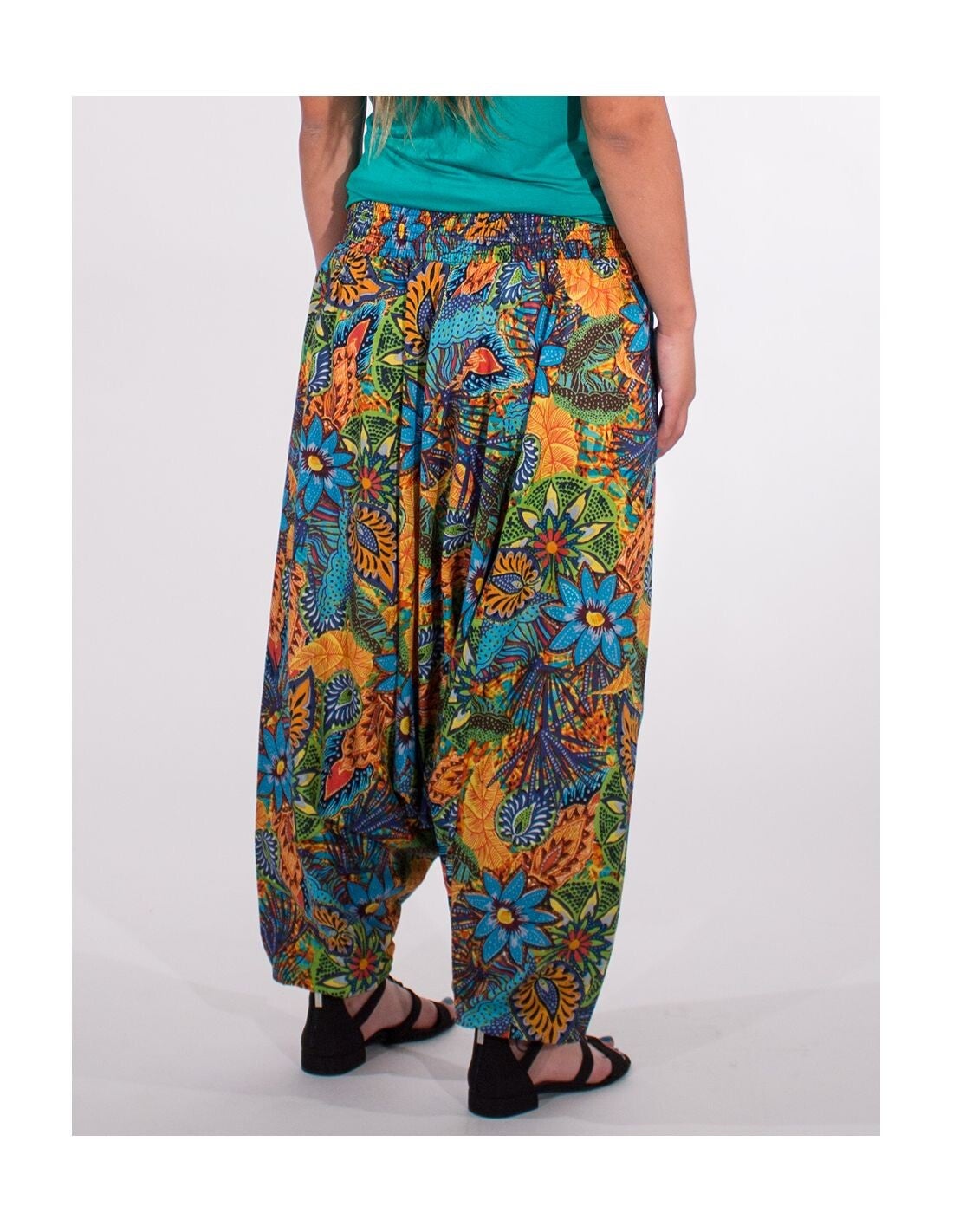 Pantalón sarouel de algodón con estampado multicolor. Cómodo, ligero y versátil, ideal para looks bohemios, casuales y días de verano.